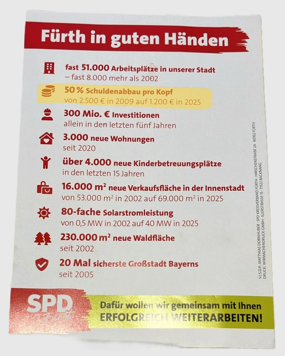 Ich denke es kann kein Zufall sein, dass sich diese Frage nahtlos in die Kommunikation des Oberbürgermeisters oder der SPD in Fürth allgemein einfügt (siehe Flyer oben). Diese betont den kontinuierlichen Schuldenabbau regelmäßig als Kern seiner bzw. ihrer Wirtschaftspolitik. Indem diese Aussage in einer repräsentativen Bürgerumfrage abgefragt wird, erhält sie eine pseudowissenschaftliche Legitimation, so, als sei das Vertrauen in diese Politik empirisch bestätigt, obwohl die Frage selbst dieses Vertrauen herstellt. Denn das Framing erzeugt eine Verzerrung in Richtung „gute Nachricht“, was die Vergleichbarkeit mit echten Wissensfragen, die neutral formuliert sind, einschränkt und die Interpretation der Ergebnisse erschwert.