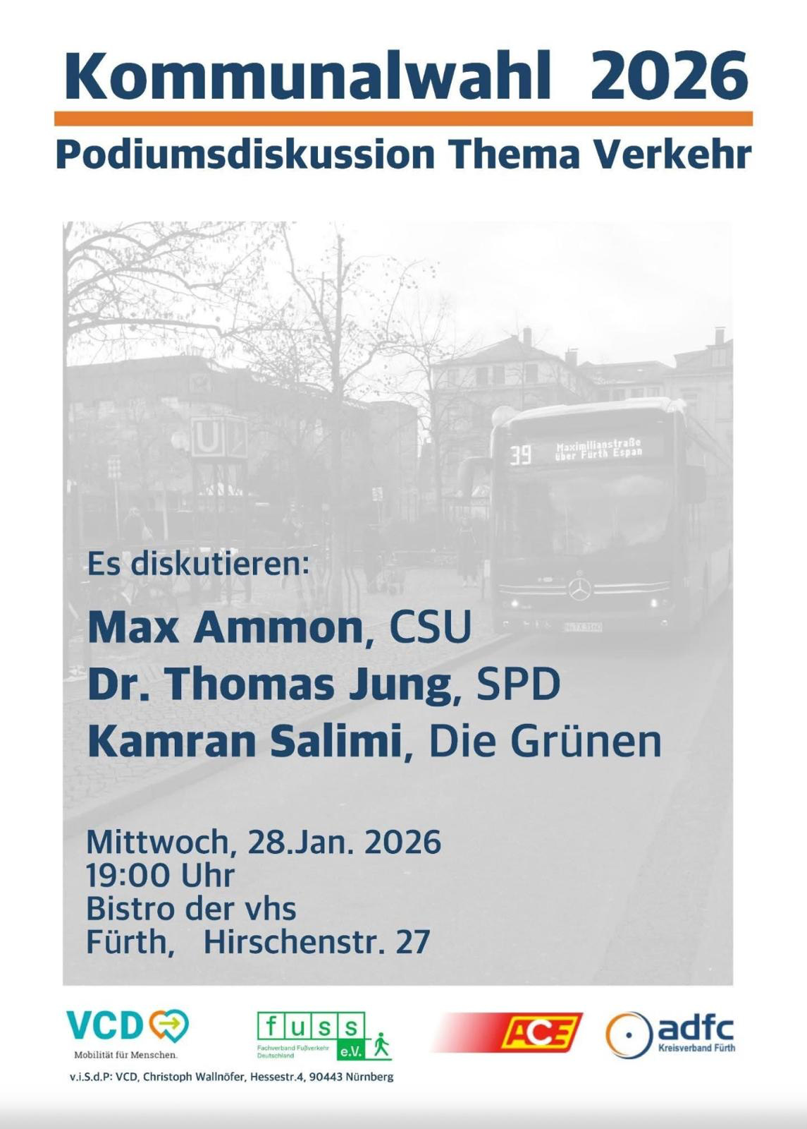 Nachdem ich die Podiumsdiskussion zum Thema „Bezahlbarer Wohnraum“ leider verpasst habe, einfach, weil ich zu spät von ihr erfahren habe, habe ich mir aber die zweite Podiumsdiskussion zur Kommunalwahl angeschaut. Das Thema: Verkehr. Veranstaltet wurde der Abend am Mittwoch, den 28.01.2026 vom VCD, dem Fuß e.V., dem ACE sowie dem ADFC Fürth.