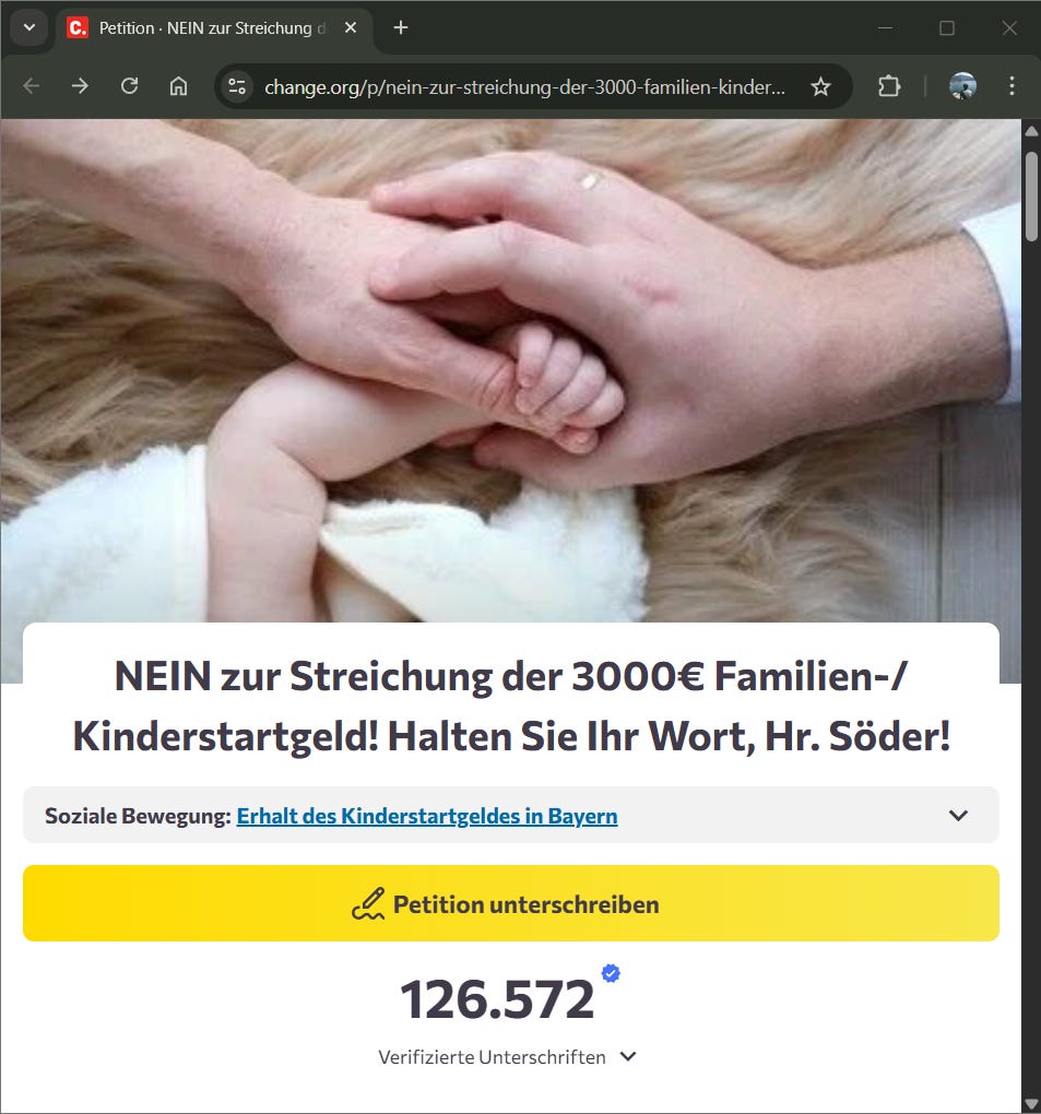 Was ich mindestens erwartet hätte, wäre eine Übergangsregelung. Zum Beispiel: Kinderstartgeld ja, aber nur noch für Kinder, die bis zum 31.12.2025 geboren werden. Auch das wäre nicht perfekt gewesen und wäre für manche Familien unfair gewesen. Aber bei Kürzungen kann man es leider nicht allen recht machen. Die jetzige Lösung dagegen ist politisch ein Totalschaden. Das zeigen nicht nur die wütenden Kommentare von Eltern, sondern auch Petitionen mit teils über 100.000 Unterschriften: